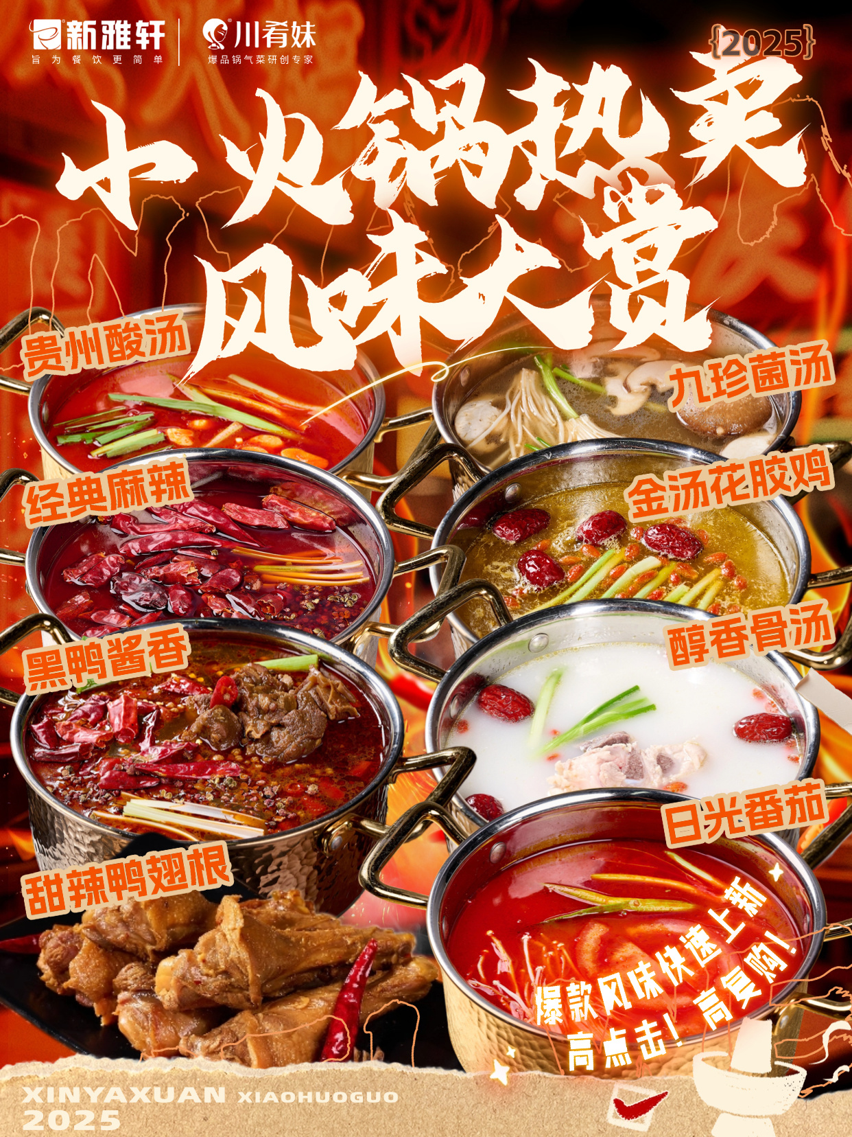 告别单一,玩转风味!8款热卖锅底,覆盖经典、地域特色与养生需求,满足不同客群。