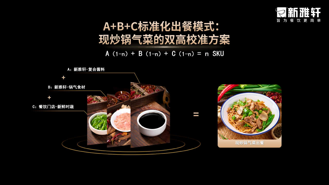 针对这一痛点,新雅轩给出了明确的解决方案:“供应链的核心使命,就是帮门店解决效率、成本、风味三大核心问题,以【餐调订制+锅气菜】整体解决方案,助力餐饮品牌实现差异化突围。”通过标准化、定制化的优质产品,搭配“A+B+C”标准化出餐模式,既能帮助餐饮品牌降低后厨人力成本、提升出餐效率,又能打造专属特色口味,实现“高毛利+高复购”,为餐饮品牌长效发展注入动力。