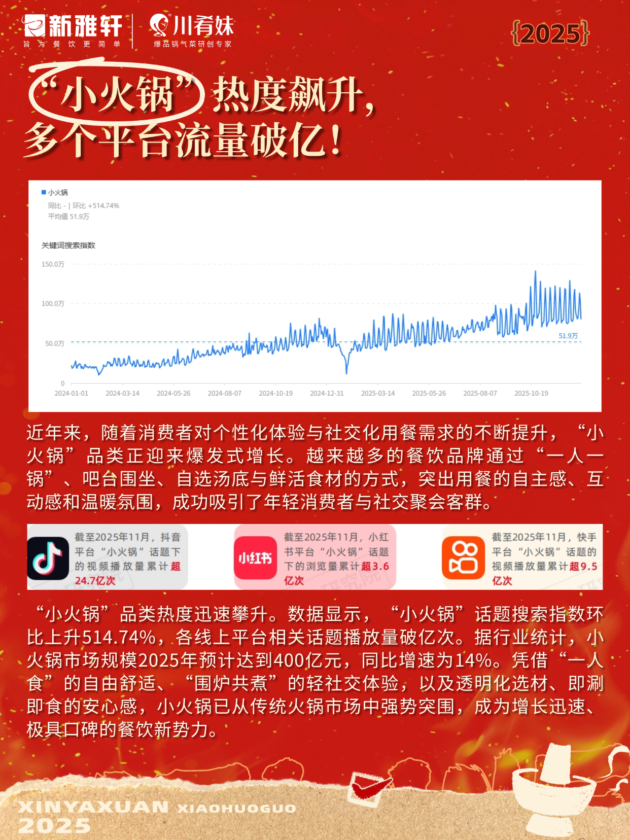 一人食经济+社交体验,小火锅正成为餐饮新增长极!✅ 场景灵活:正餐、简餐、外卖皆宜✅ 毛利可观:锅底标准化,成本可控利润高✅ 复购率高:口味多样,搭配丰富,持续吸引顾客趋势已明,供给先行。一站式解锁完整盈利方案,助您精准卡位,抢占市场。